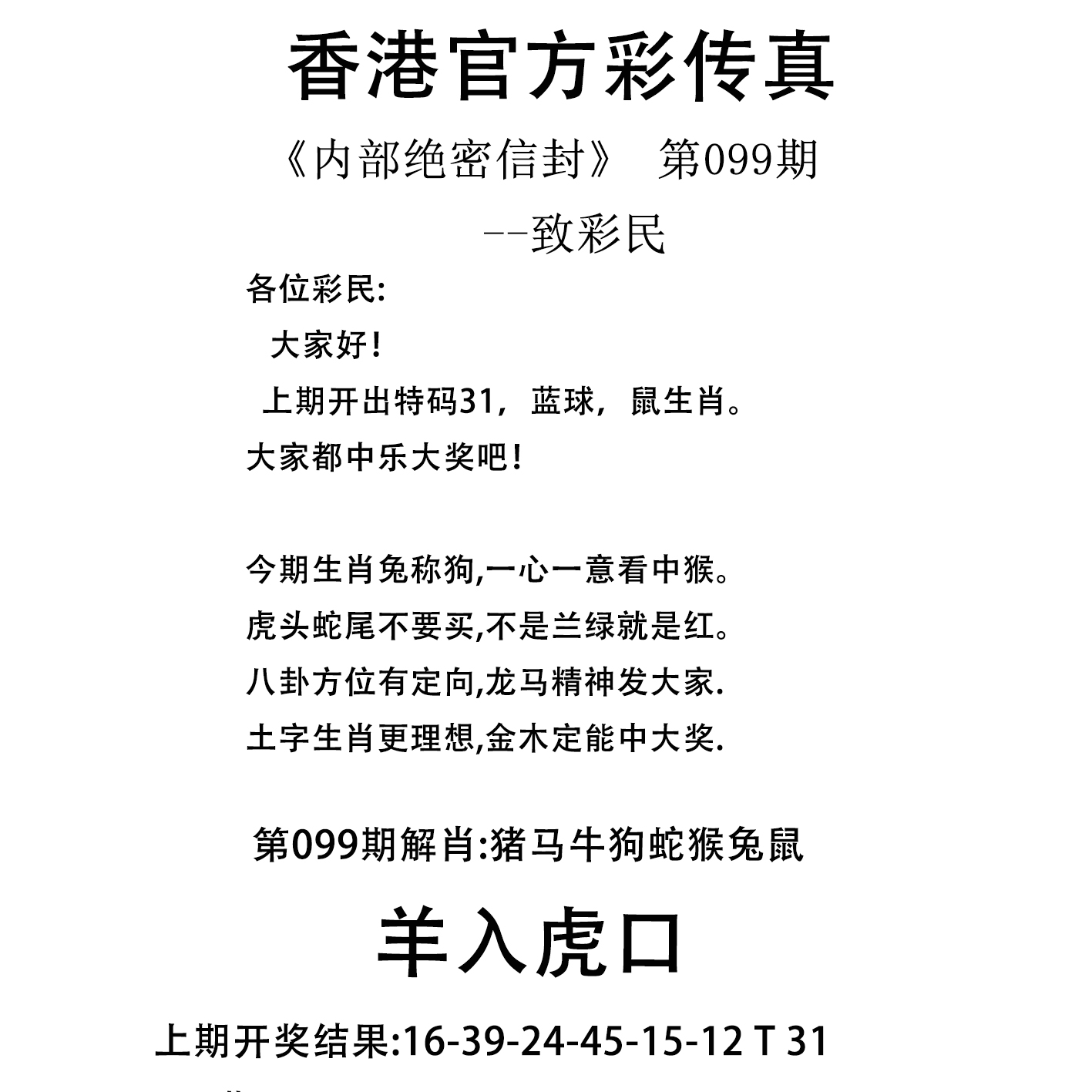 | 099期: | 平特二肖-->牛猴 | 兔28 |